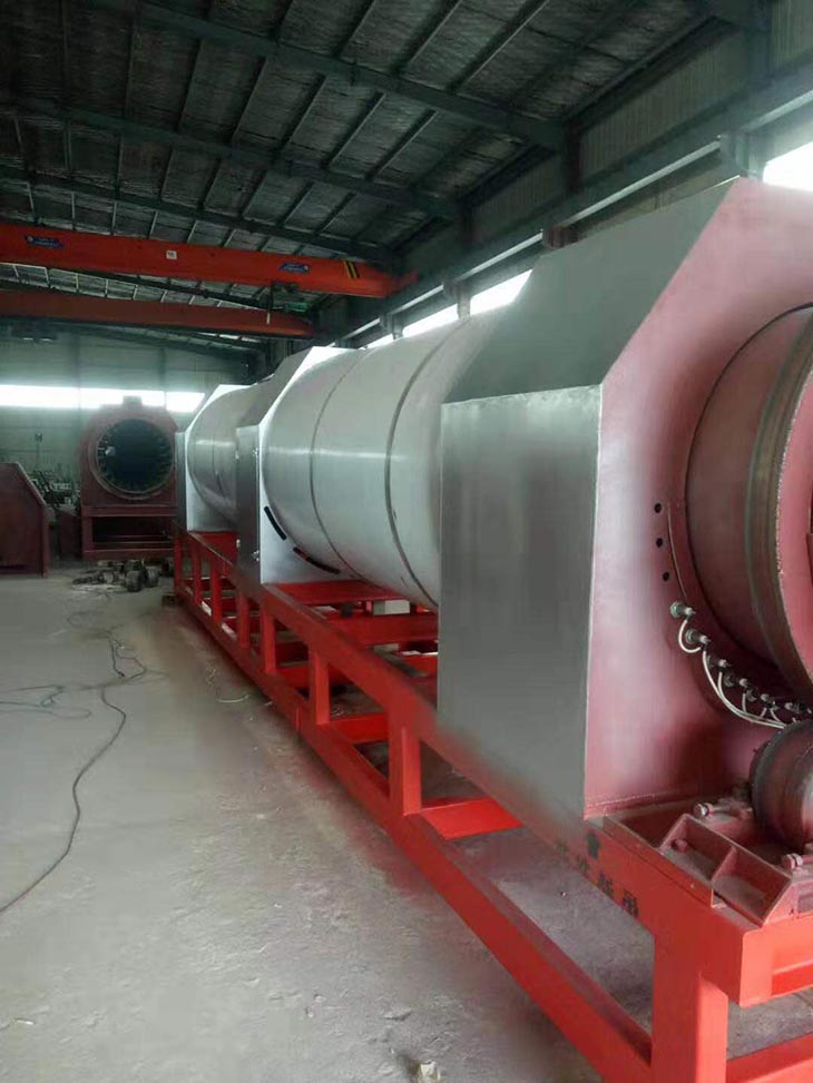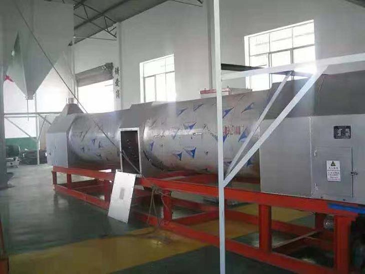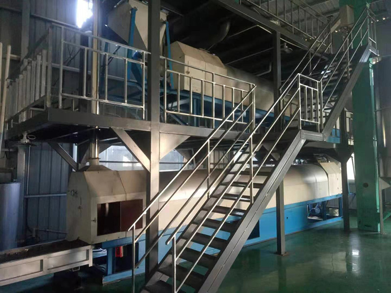 我們解決其技術(shù)問題所采用的技術(shù)方案是:一種新型環(huán)保節(jié)能熱風(fēng)炒爐,由電源供電,包括第一燃燒室、第二燃燒室、熱風(fēng)炒爐滾筒、存料機(jī)、自動喂料器、出料機(jī)、引風(fēng)機(jī)和排潮風(fēng)機(jī),所述熱風(fēng)炒爐滾筒的入口端通過自動喂料器與所述存料斗連通,所述熱風(fēng)炒爐滾筒的入口端還通過風(fēng)道與所述排潮風(fēng)機(jī)連通,所述熱風(fēng)炒爐滾筒的出口端與出料機(jī)連通,所述第一燃燒室和第二燃燒室通過風(fēng)道與引風(fēng)機(jī)連通,所述第一燃燒室和第二燃燒室分別位于所述熱風(fēng)炒爐滾筒的下方,所述熱風(fēng)炒爐滾筒軸心線與水平面形成2°到8°的夾角,所述第一燃燒器和第二燃燒器安裝位置在相應(yīng)燃燒室的前端或者相應(yīng)燃燒室的兩個側(cè)面。我們設(shè)備取消了原熱風(fēng)炒爐所配套的單獨(dú)熱風(fēng)爐、彎段風(fēng)道或直段風(fēng)道;在炒爐滾筒下方設(shè)計(jì)安裝兩份熱風(fēng)燃燒室,用燃燒器產(chǎn)生的熱風(fēng)直接對滾筒進(jìn)行加熱,******限度地縮減了炒爐散熱環(huán)節(jié)和面積,從而實(shí)現(xiàn)炒爐連段式加熱。與現(xiàn)有設(shè)備相比,我們公司設(shè)備充分利用了熱風(fēng)釋放的熱量,減少了熱量損失,單噸油料或糧食加工消耗添人氣甚至能降低到25nm3,降低了17%,節(jié)能降耗效果非常明顯,得到了客戶的一致好評。與現(xiàn)有設(shè)備相比,同等日加工量,所配兩臺燃燒器合計(jì)功率比現(xiàn)有設(shè)備燃燒器功率下降20%-30%,熱風(fēng)設(shè)定溫度有750-800℃下降到400-500℃,明顯延長了炒爐的使用壽命。第一燃燒室和第二燃燒室的功能各不相同,工作溫度也不一致,第一燃燒室和第二燃燒室能夠?qū)崿F(xiàn)分段加熱溫度控制,更加靈活與合理,安全可靠,便于操作與控制。